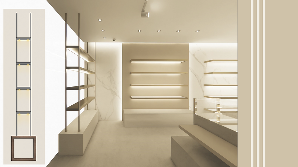This project was designed as part of an academic lighting course. it is a luxury store for women's shoes, bags, and accessories, focusing on creating a sophisticated ambiance that enhances the beauty of the displayed products.